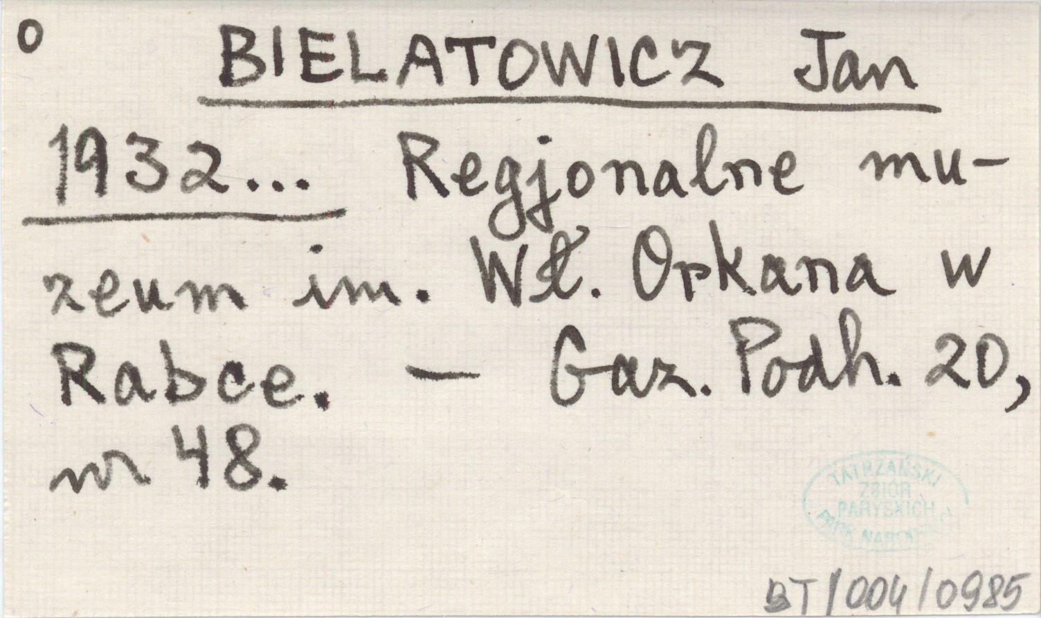 BIELATOWICZ Jan 1932... Regjonalne muzeum im. Wł. Orkana w Rabce.