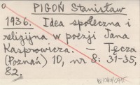 PIGOŃ Stanisław 1936 Idea społeczna i religijna w poezji Jana Kasprowicza.