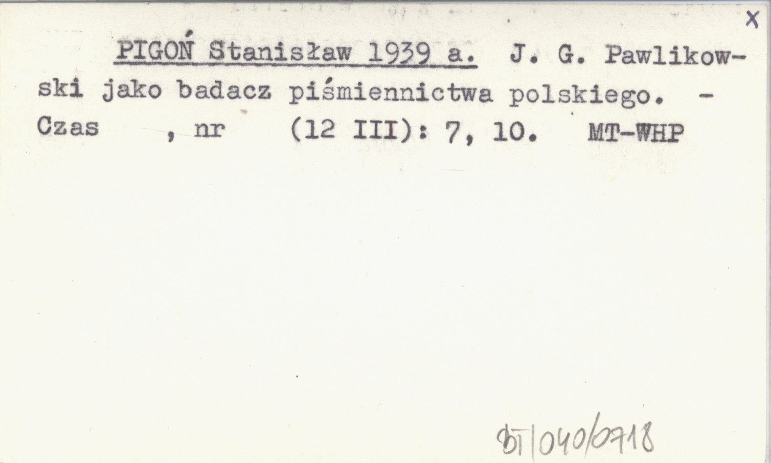 PIGOŃ Stanisław 1939 a J. G. Pawlikowski jako badacz piśmiennictwa polskiego.