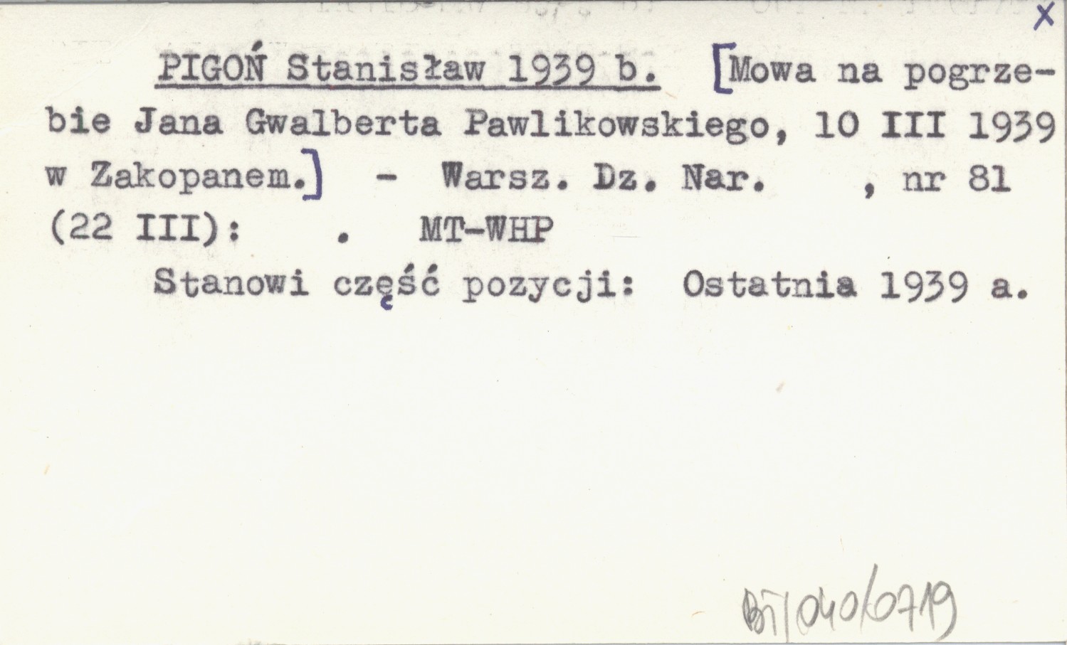 PIGOŃ Stanisław 1939 b [Mowa na pogrzebie Jana Gwalberta Pawlikowskiego, 10 III 1939 w Zakopanem.]
