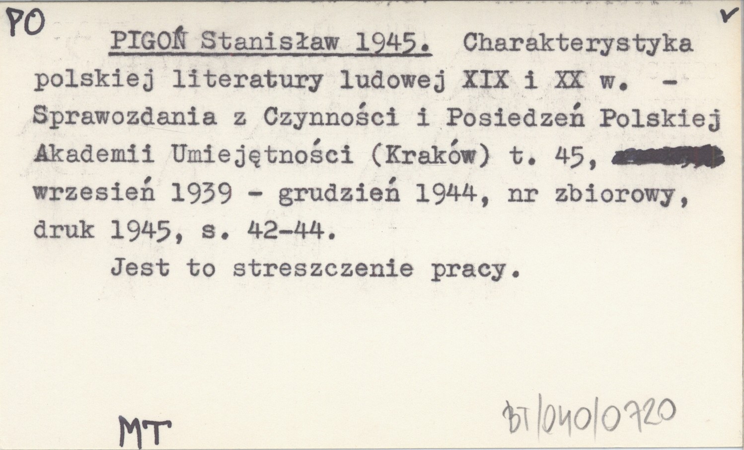 Sprawozdania z Czynności i Posiedzeń Polskiej Akademii Umiejętności (Kraków) , T. 45, wrzesień 1939-grudzień 1944, nr zbiorowy, druk 1945: 42-44. Jest to streszczenie pracy.