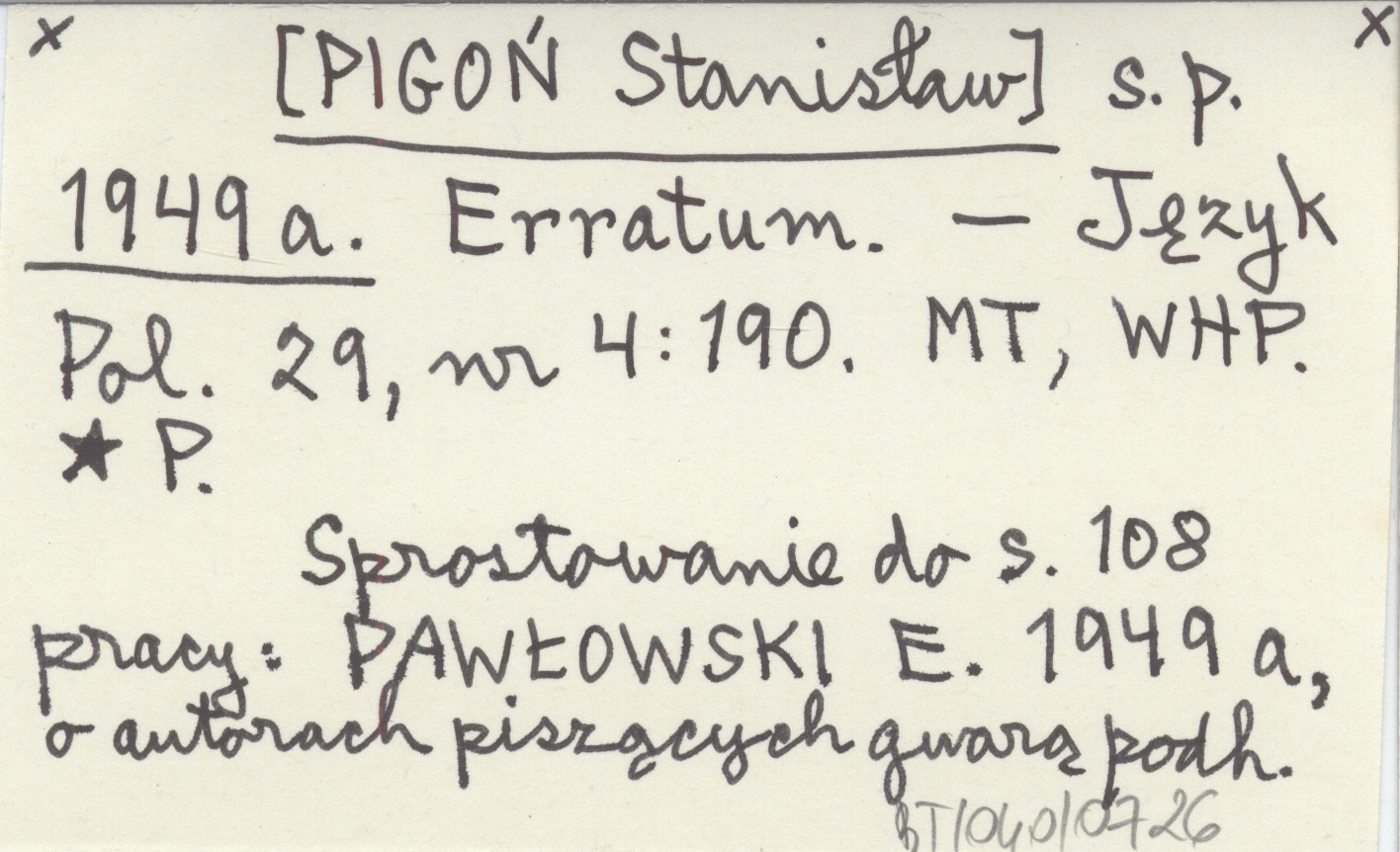 Język Polski, 29, nr 4: 190. Sprostowanie do s. 108 pracy: PAWŁOWSKI E. 1949 a, o autorach piszących gwarą podhalańską.
