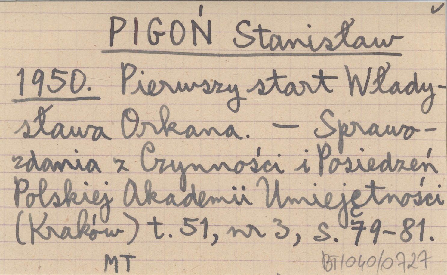 PIGOŃ Stanisław 1950 Pierwszy start Władysława Orkana.
