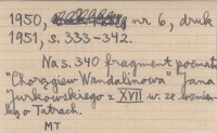 Sprawozdania z Czynności i Posiedzeń Polskiej Akademii Umiejętności (Kraków) , T. 51, r. 1950, nr 6, druk 1951: 333-342. Na s. 340 fragment poematu "Chorągiew Wandalinowa" Jana Jurkowskiego z XVII w. ze wzmianką o Tatrach.