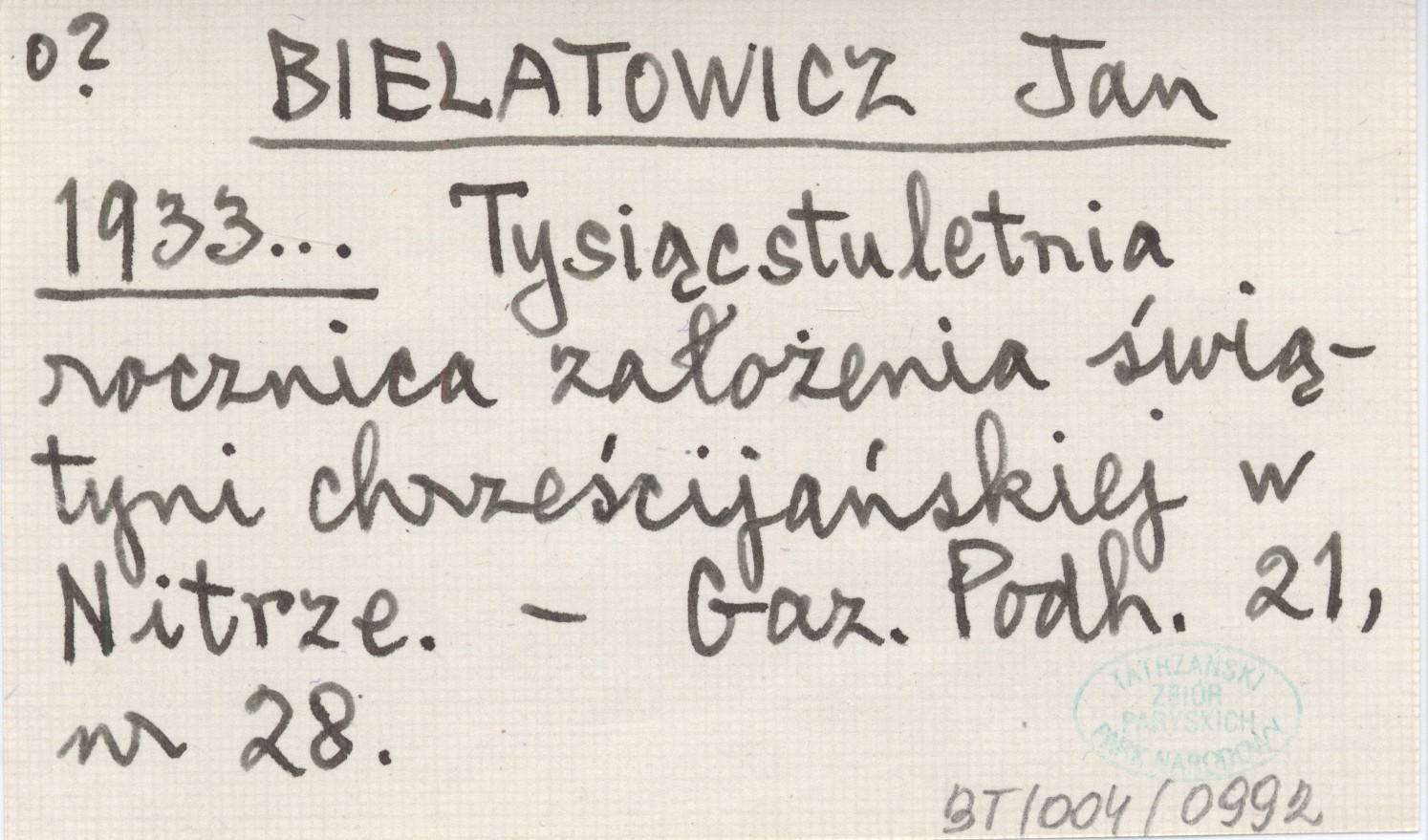 BIELATOWICZ Jan 1933... Tysiącstuletnia rocznica założenia świątyni chrześcijańskiej w Nitrze.