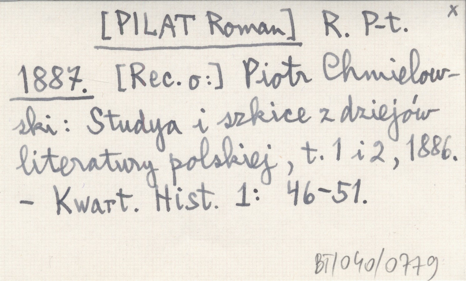 R. P-t. [PILAT Roman] 1887 [Rec. o:] Piotr Chmielowski: Studya i szkice z dziejów literatury polskiej. T. 1 i 2. 1886.