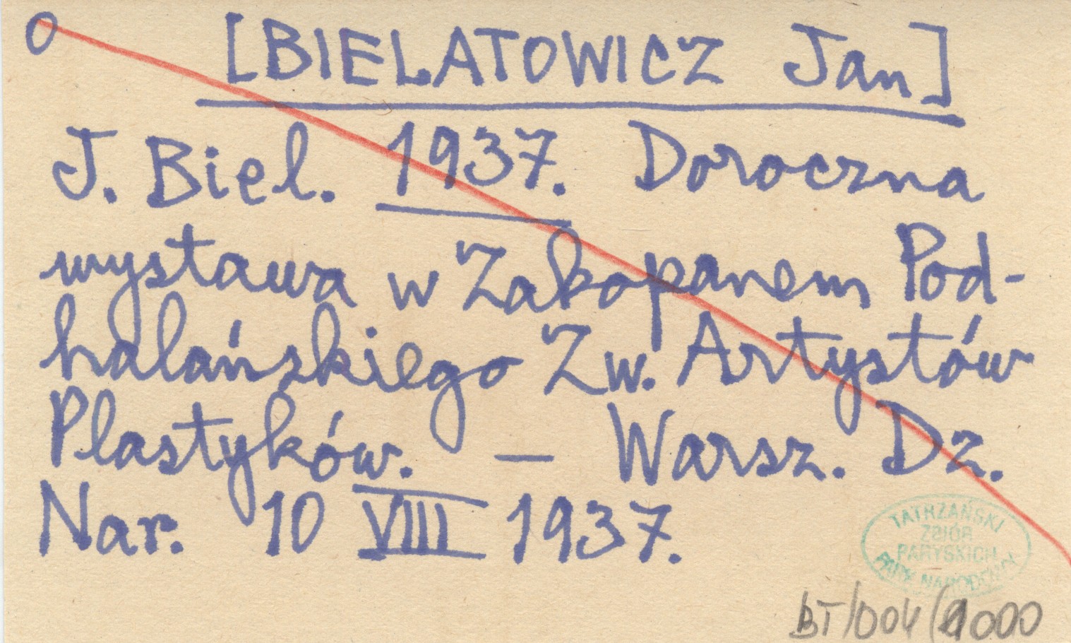 J. Biel. [BIELATOWICZ Jan] 1937 Doroczna wystawa w Zakopanem Podhalańskiego Zw. Artystów Plastyków.