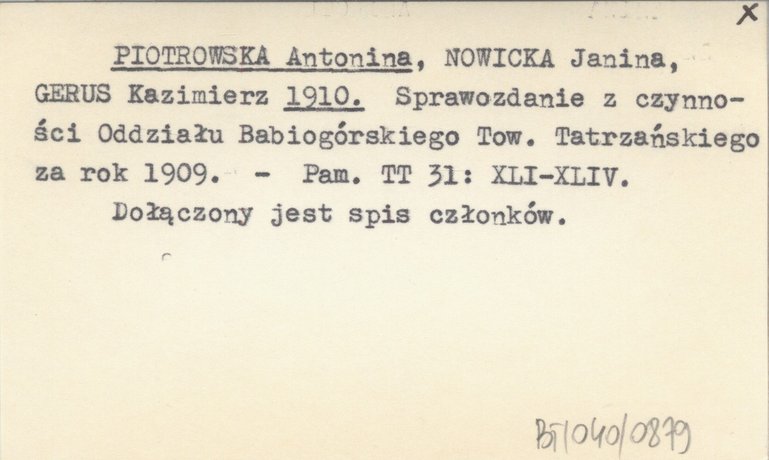 PIOTROWSKA Antonina NOWICKA, Janina. ; GERUS, Kazimierz. ; 1910 Sprawozdanie z czynności Oddziału Babiogórskiego Tow. Tatrzańskiego za rok 1909.