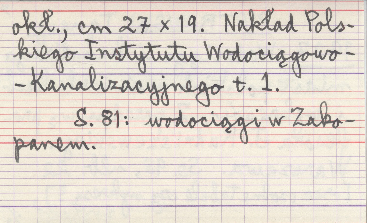 Warszawa , T. 1, 98, [22] s., [osobne k.?], okł., 27x19 cm. S. 81: wodociągi w Zakopanem. Nakład Polskiego Instytutu Wodociągowo-Kanalizacyjnego.