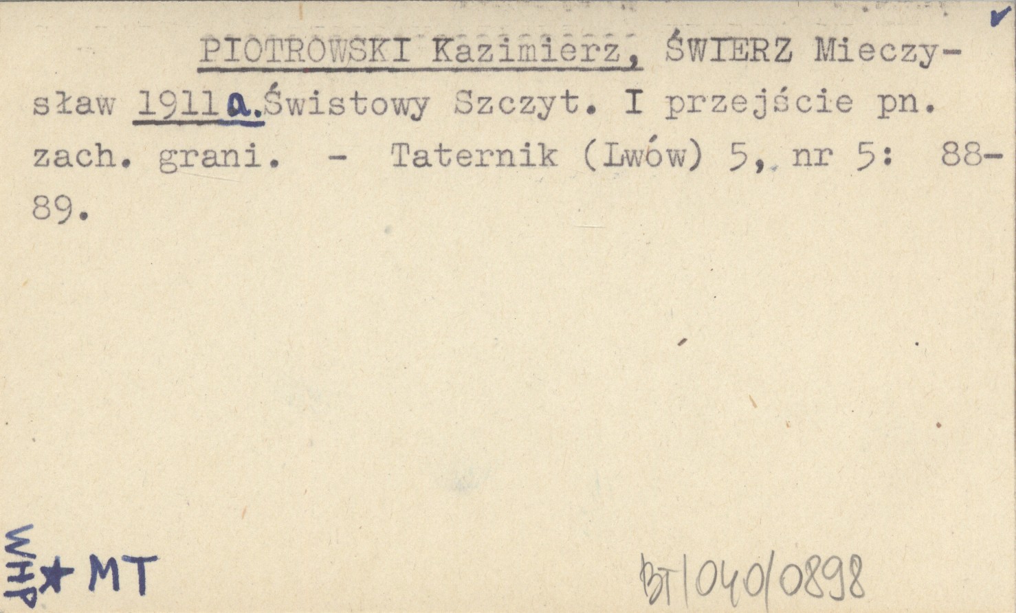 PIOTROWSKI Kazimierz ŚWIERZ, Mieczysław. ; 1911 a Świstowy Szczyt. I przejście pn. zach. grani.