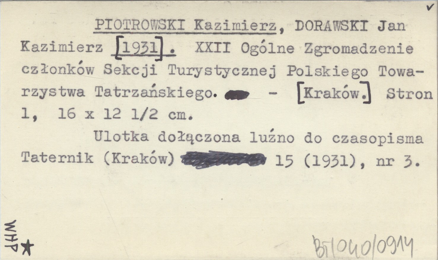PIOTROWSKI Kazimierz DORAWSKI, Jan Kazimierz. ; [1931] XXII Ogólne Zgromadzenie członków Sekcji Turystycznej Polskiego Towarzystwa Tatrzańskiego.