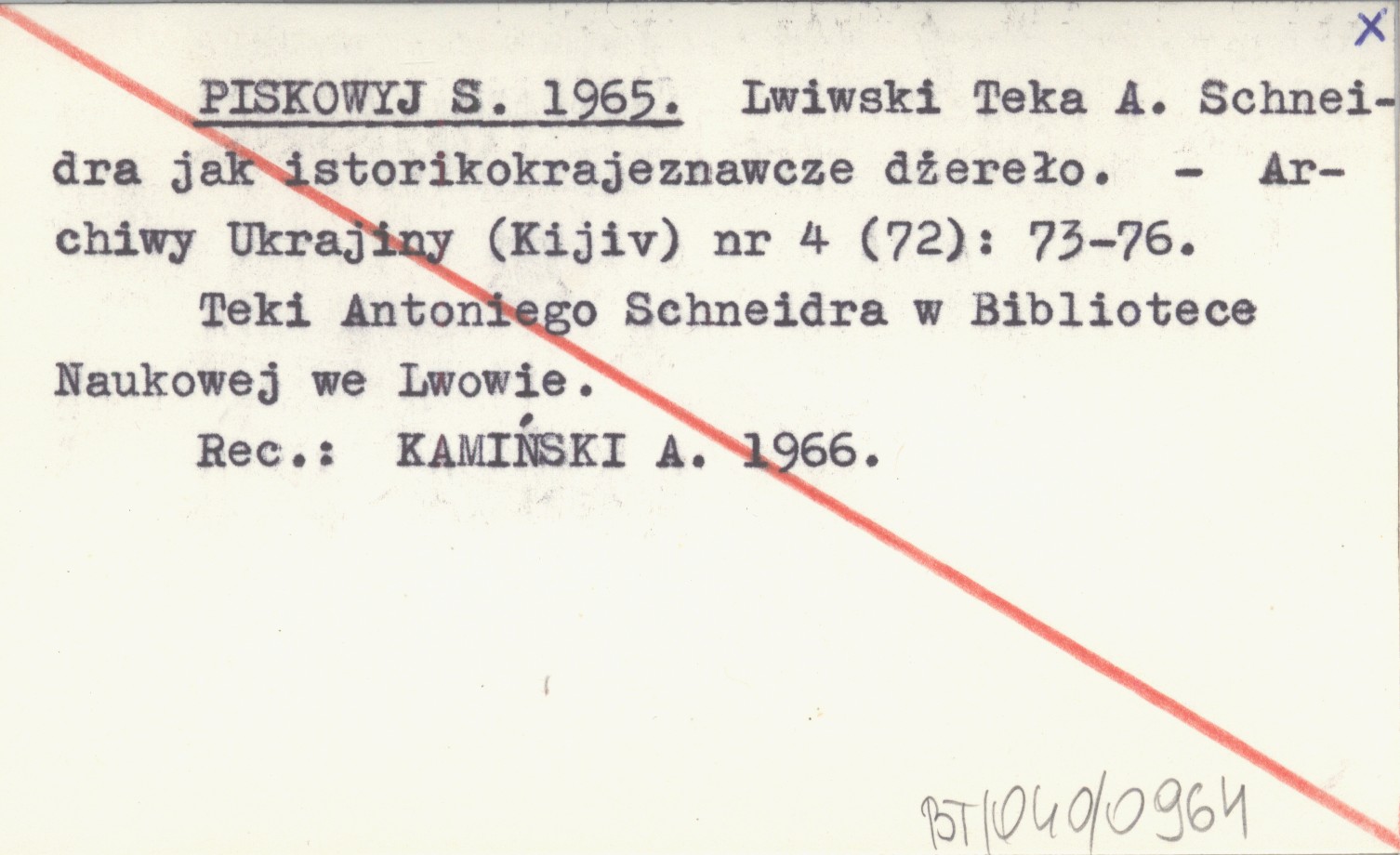 Archiwy Ukrajiny (Kijiv) , Nr 4 (72): 73-76. Teki Antoniego Schneidera w Bibliotece Naukowej we Lwowie. REC: KAMIŃSKI A. 1966