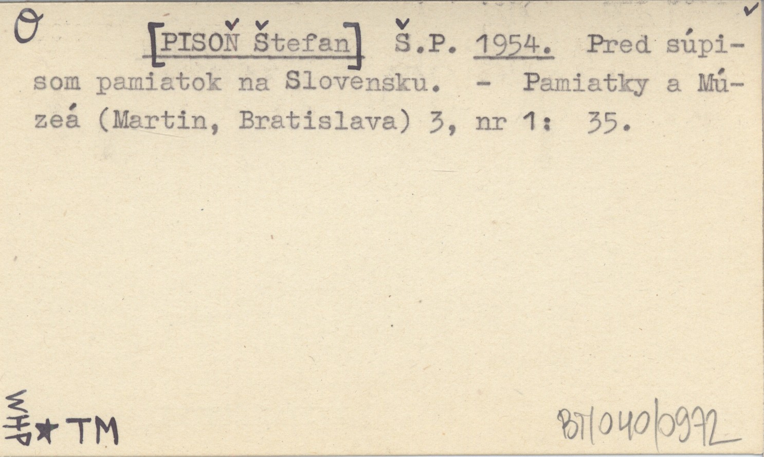Š. P. [PISOŇ Štefan] 1954 Pred súpisom pamiatok na Slovensku.