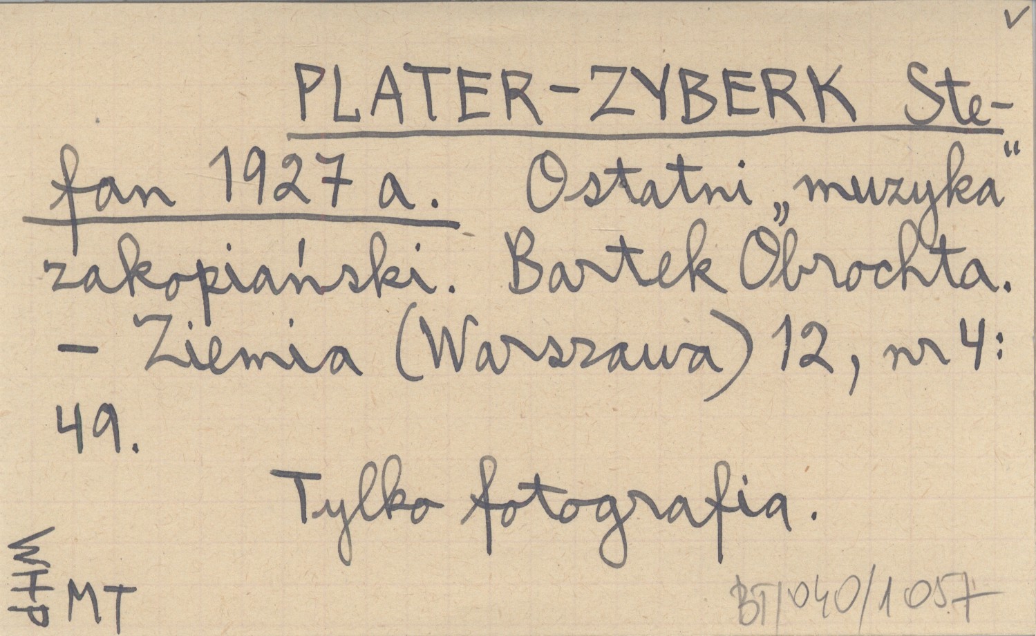 PLATER-ZYBERK Stefan 1927 a Ostatni "muzyka" zakopiański. Bartek Obrochta.