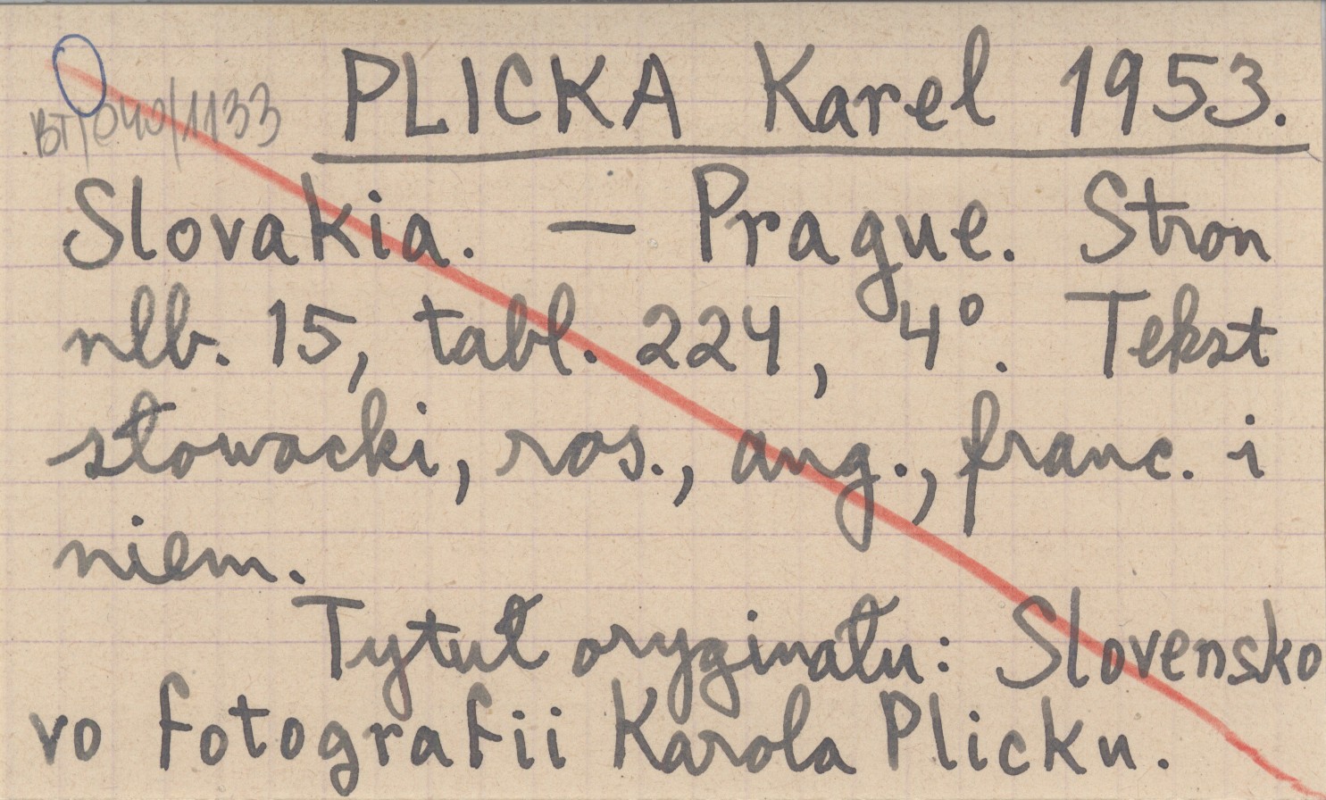 Prague , [15] s., 224 k., 4°. Tekst słowacki, rosyjski, angielski, francuski i niemiecki. Tytuł oryginału: Slovensko vo fotografii Karola Plicku.