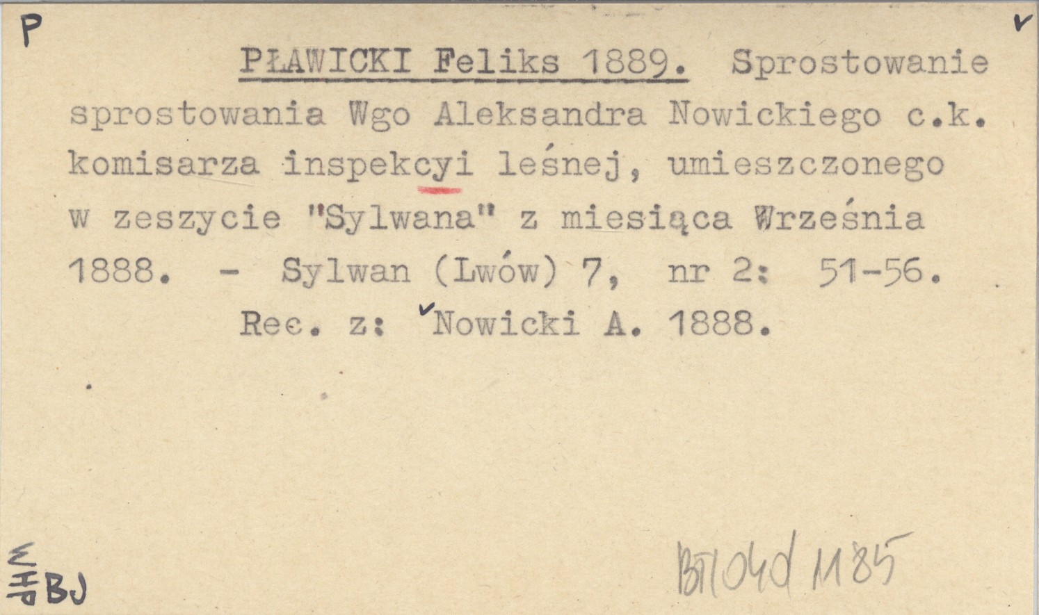 PŁAWICKI Feliks 1889 Sprostowanie sprostowania Wgo Aleksandra Nowickiego c.k. komisarza inspekcyi leśnej, umieszczonego w zeszycie "Sylwana" z miesiąca Września 1888.