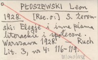 PŁOSZEWSKI Leon 1928 [Rec. o:] S. Żeromski: Elegje i inne pisma literackie i społeczne. Warszawa 1928.