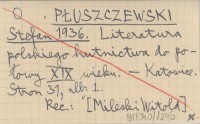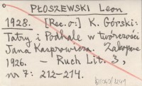 PŁOSZEWSKI Leon 1928 [Rec. o:] K. Górski: Tatry i Podhale w twórczości Jana Kasprowicza. Zakopane 1926.