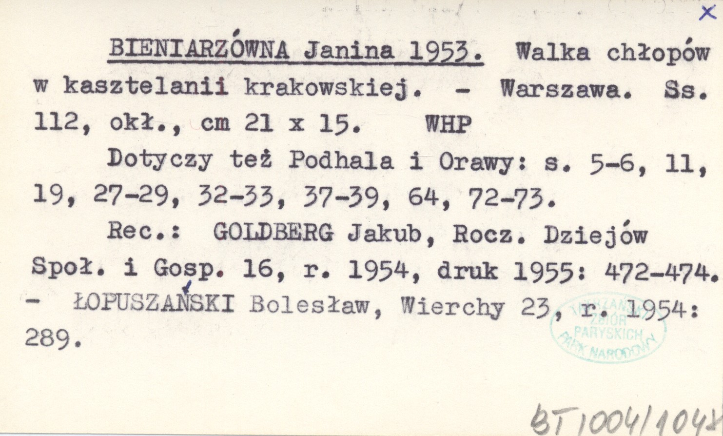 Warszawa , 112 s., okł., 21x15 cm. Dotyczy też Podhala i Orawy: s. 5-6, 11, 19, 27-29, 32-33, 37-39, 64, 72-73. REC: GOLDBERG Jakub, Rocz. Dziejów Społ. i Gosp. 16, r. 1954, druk 1955: 472-474 ; ŁOPUSZAŃSKI Bolesław, Wierchy 23, r. 1954: 289 ;