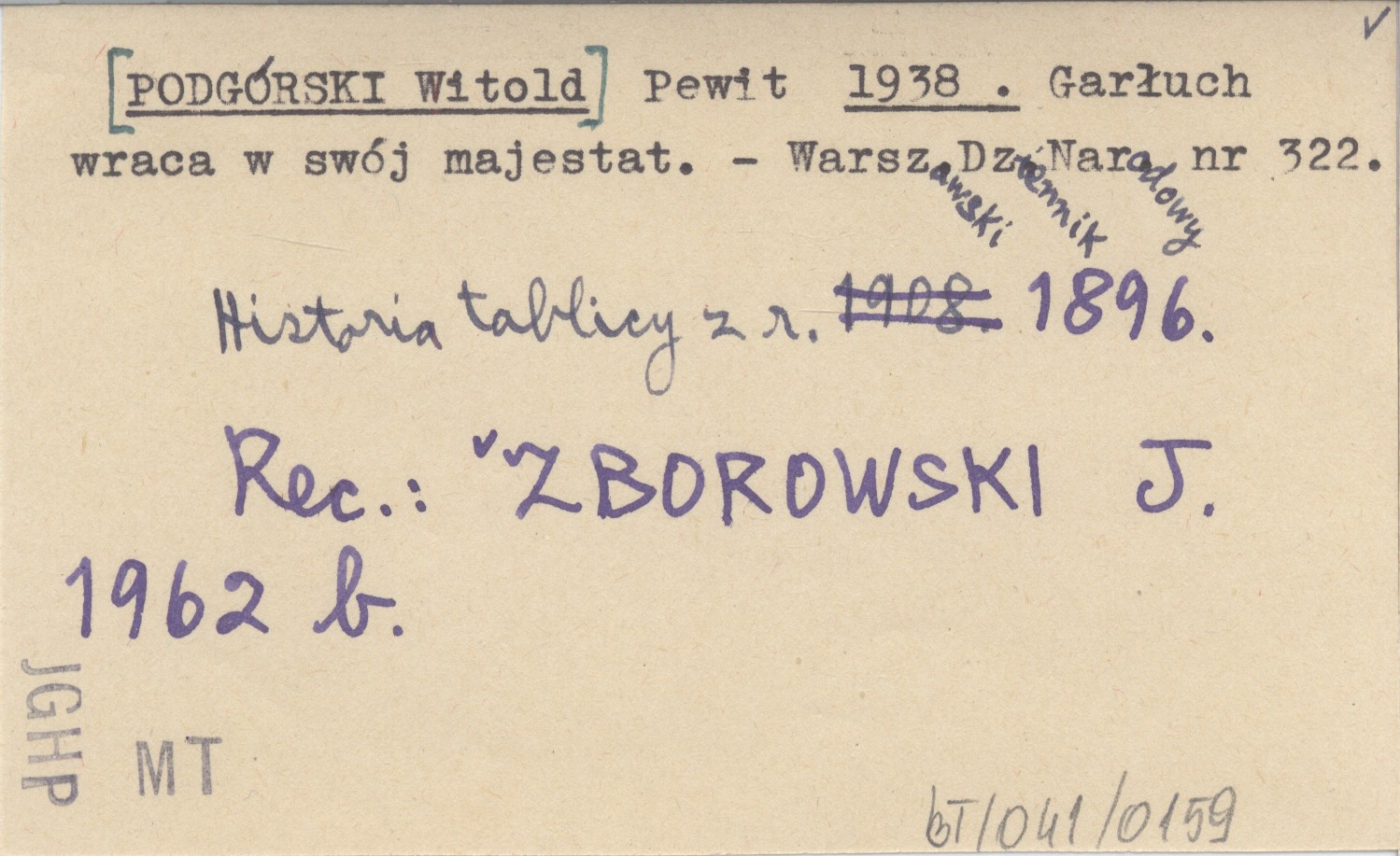 Warszawski Dziennik Narodowy, Nr 322. Historia tablicy z r. 1896. REC: ZBOROWSKI J. 1962 b