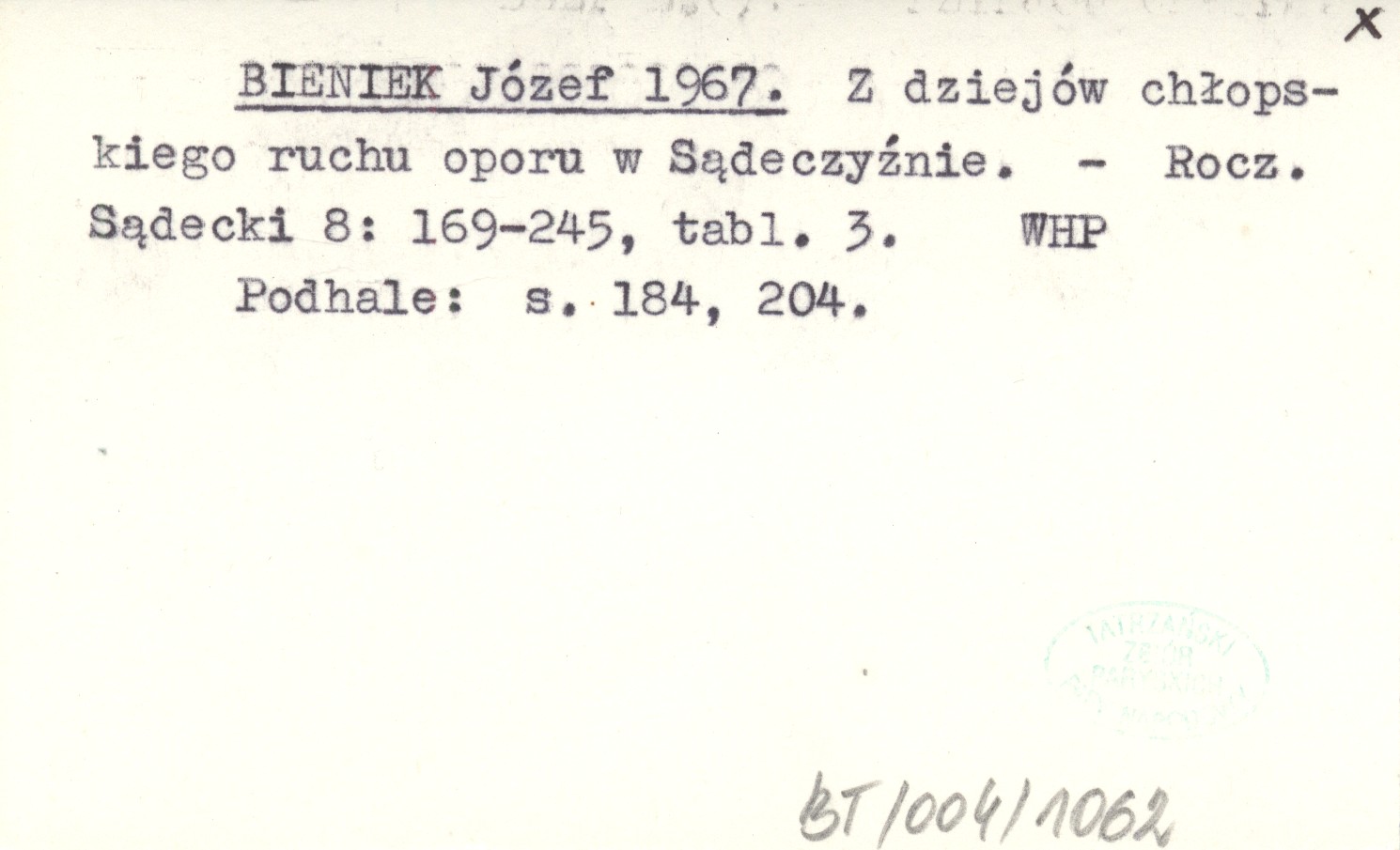 BIENIEK Józef 1967 Z dziejów chłopskiego ruchu oporu w Sądeczyźnie.