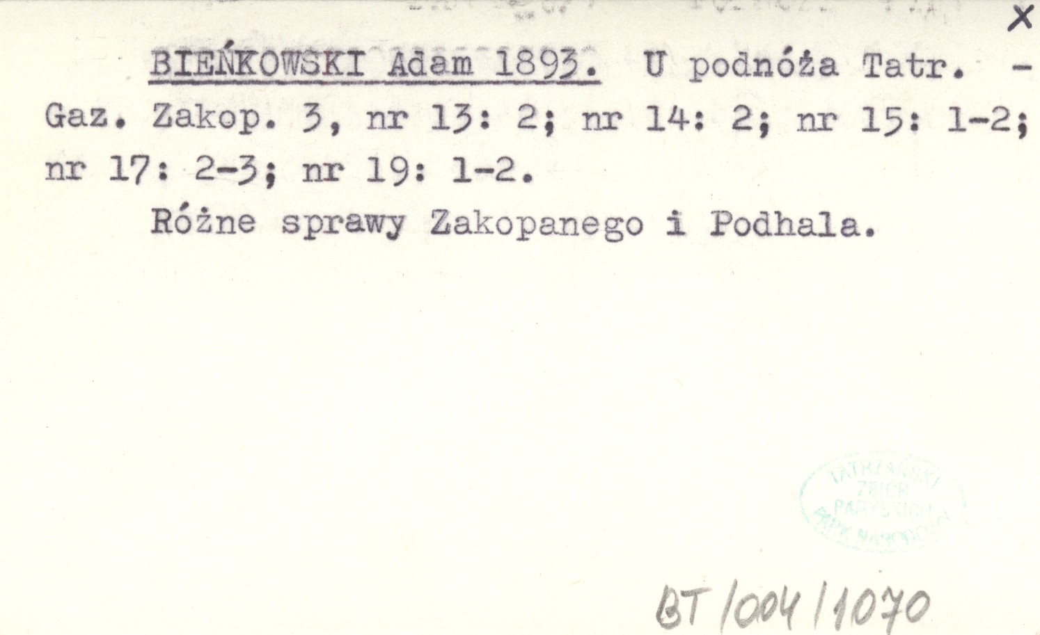 Gazeta Zakopiańska, 3, nr 13: 2 ; nr 14: 2 ; nr 15: 1-2 ; nr 17: 2-3 ; nr 19: 1-2. Różne sprawy Zakopanego i Podhala.