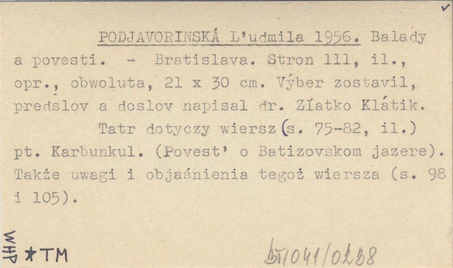 Bratislava , 111 s., il., opr., obw., 21x30 cm. Tatr dotyczy wiersz (s. 75-82, il.) pt. Karbunkul. (Povesť o Batizovskom jazere). Výber zostavil, predslov a doslov napisal dr. Zlatko Klátik. Także uwagi i objaśnienia tegoż wiersza (s. 98 i 105).