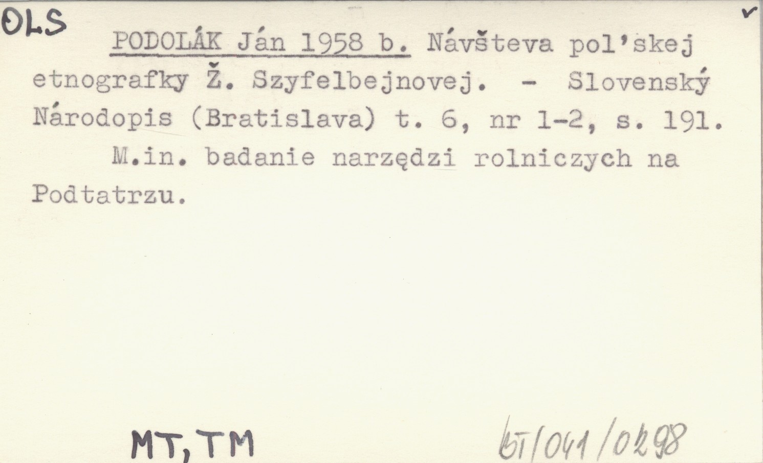 Slovenský Národopis (Bratislava) , T. 6, nr 1-2: 191. M. in. badanie narzędzi rolniczych na Podtatrzu.