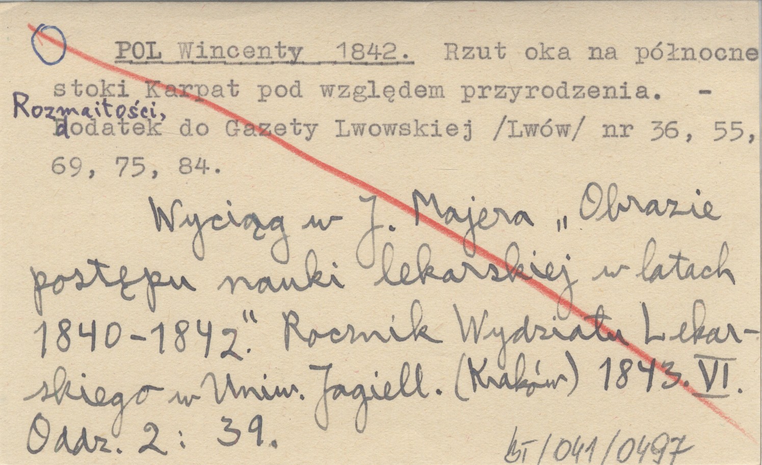 Rozmaitości, dodatek do Gazety Lwowskiej (Lwów) , Nr 36, 55, 69, 75, 84. Wyciąg w J. Majera "Obrazie postępu nauki lekarskiej w latach 1840-1842". Rocznik Wydziału Lekarskiego w Uniwersytecie Jagiellońskim (Kraków) 1843 VI. Oddz. 2: 39.