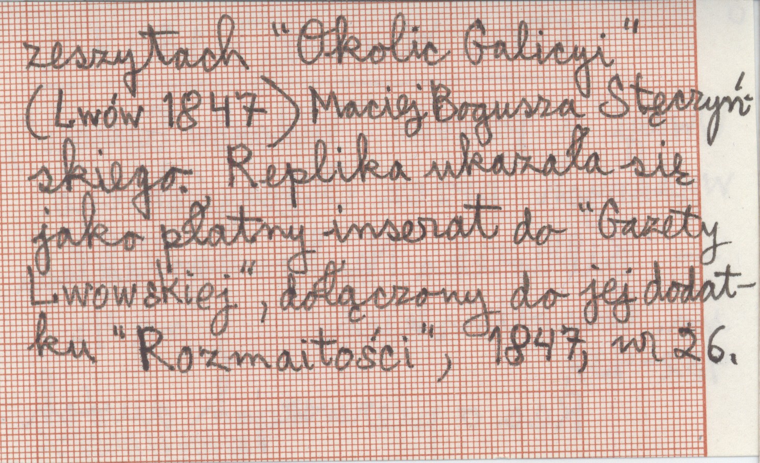 Biblioteka Naukowego Zakładu im. Ossolińskich, Nr 4: 432-437. Recenzja o pierwszych dwóch zeszytach "Okolic Galicyi" (Lwów 1847) Macieja Bogusza Stęczyńskiego. Replika ukazała się jako płatny inserat do "Gazety Lwowskiej", dołączony do jej dodatku "Rozmaitości", 1847, nr 26.