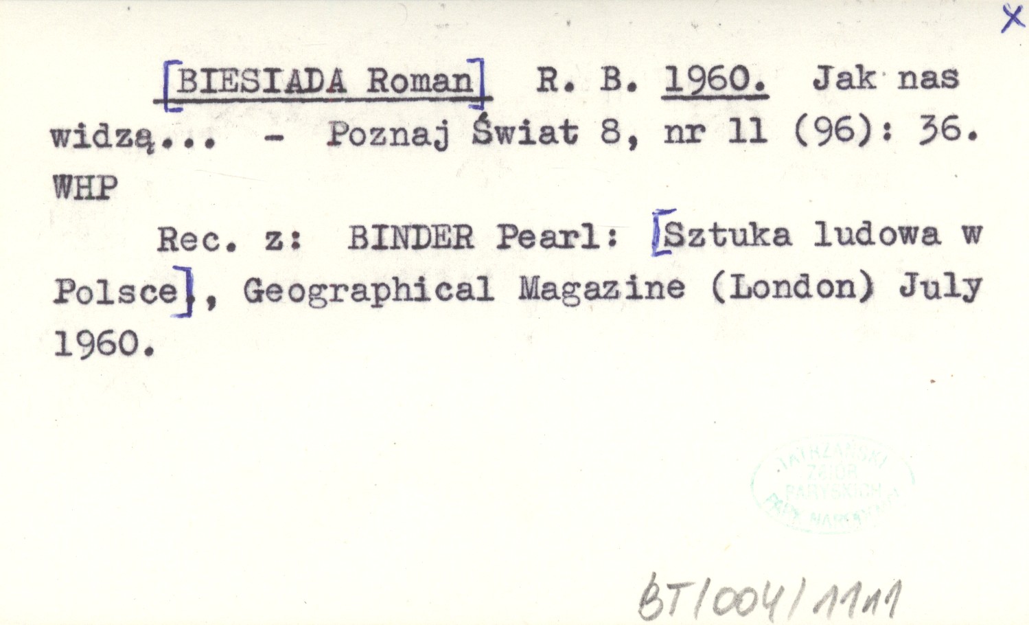 Poznaj Świat, 8, nr 11 (96): 36. REC: BINDER Pearl: [Sztuka ludowa w Polsce], Geographical Magazine (London) July 1960