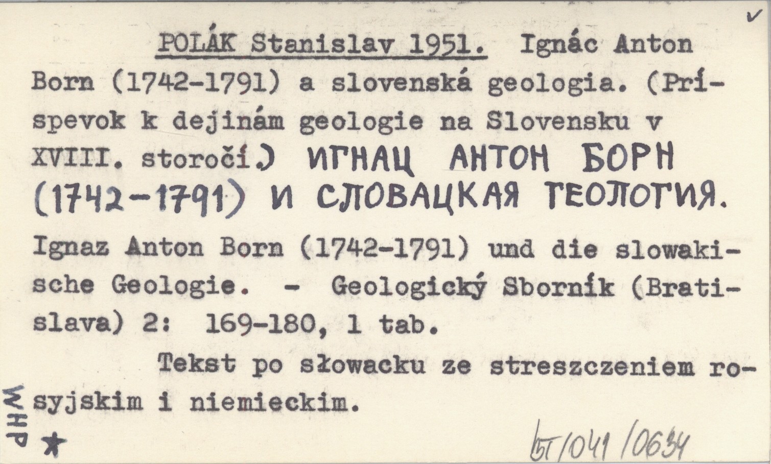 POLÁK Stanislav 1951 Ignác Anton Born (1742-1791) a slovenská geologia. (Príspevok k dejinám geologie na Slovensku v XVIII. storočí). Ignac Anton Born (1742-1791) i Slovackaja geologija. Ignaz Anton Born (1742-1791) und die slowakische Geologie.