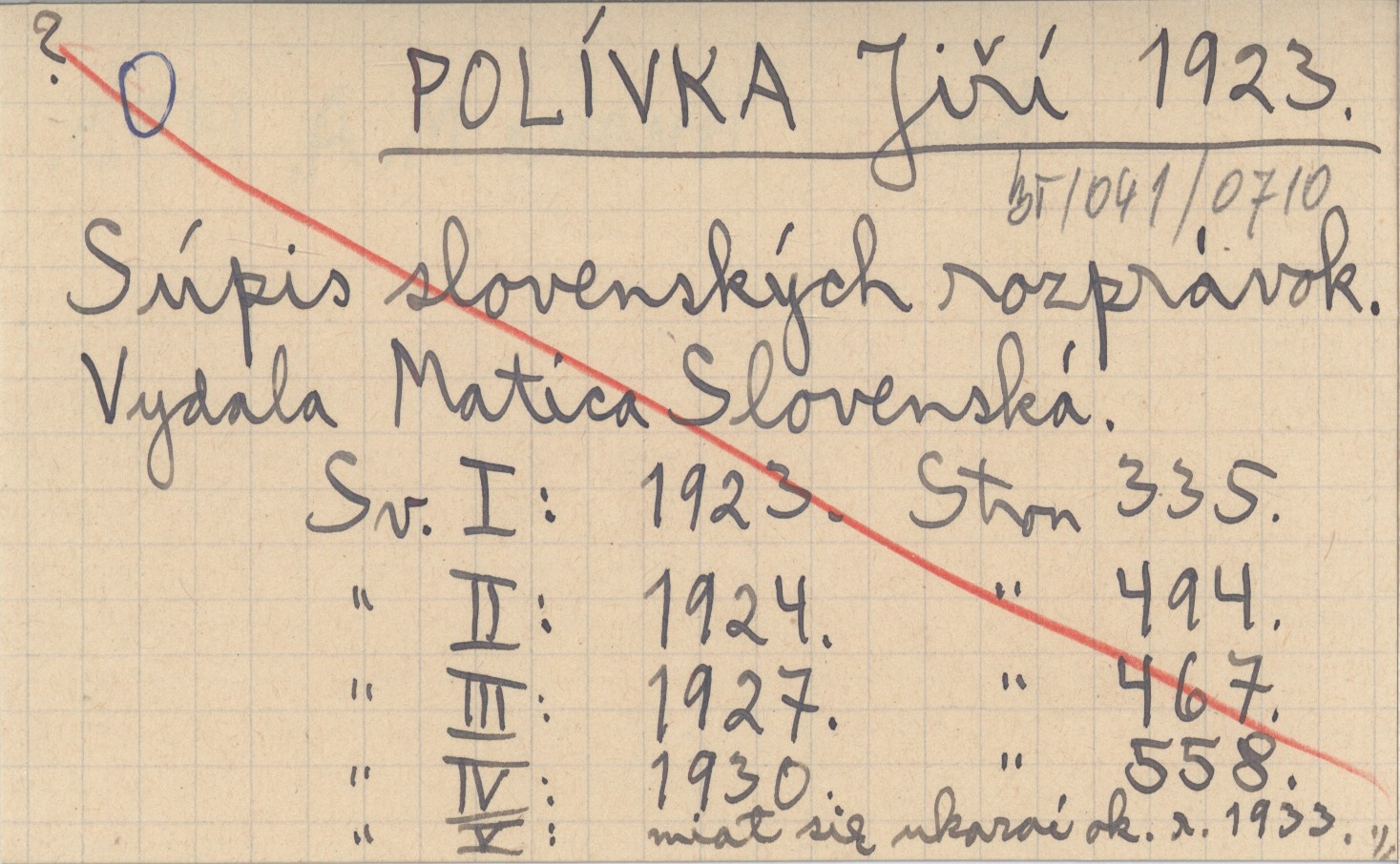 Matica Slovenská, , Sv. I (1923), 335 s. ; II (1924), 494 s. ; III (1927), 467 s. ; IV (1930), 558 s. ; V (ok. 1933). REC: HUSKA M. A. 1933