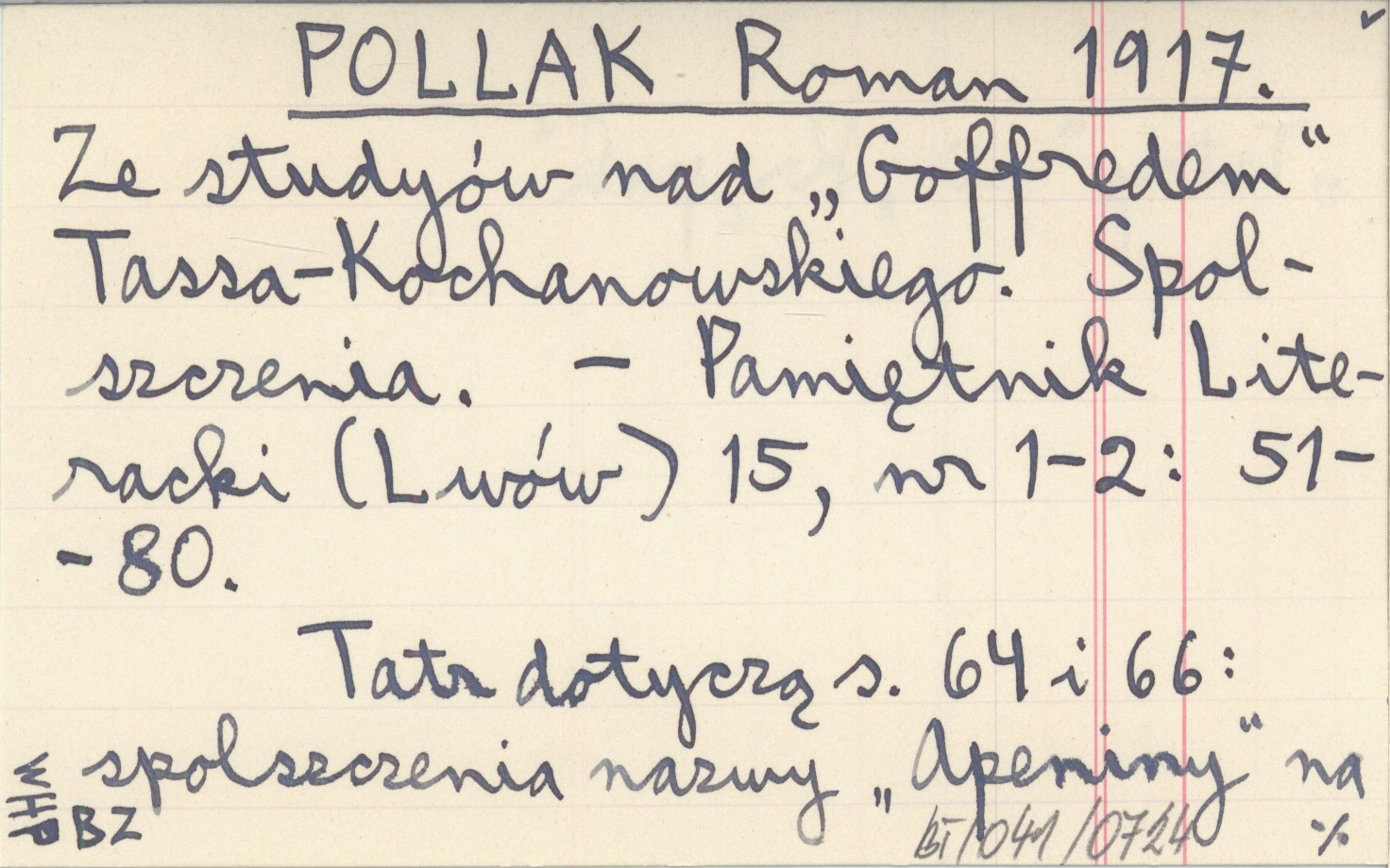POLLAK Roman 1917 Ze studyów nad "Goffredem" Tassa-Kochanowskiego. Spolszczenia.