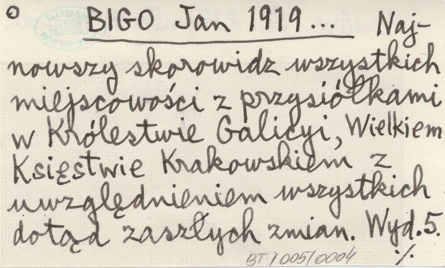 BIGO Jan 1919... Najnowszy skorowidz wszystkich miejscowości z przysiółkami w Królestwie Galicyi, Wielkiem Księstwie Krakowskiem z uwzględnieniem wszystkich dotąd zaszłych zmian.