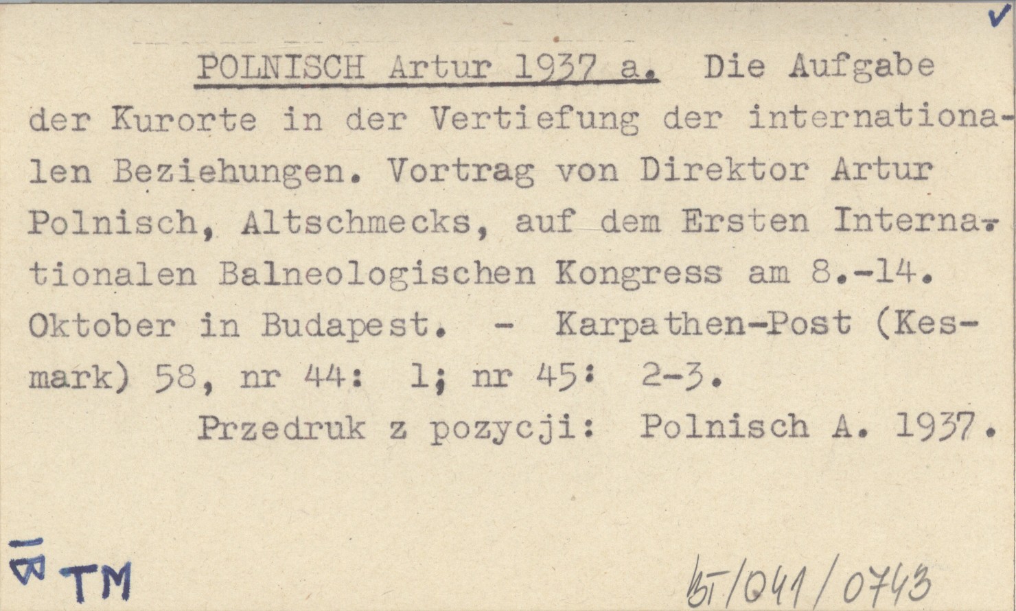 POLNISCH Artur 1937 a Die Aufgabe der Kurorte in der Vertiefung der internationalen Beziehung. Vortrag von Direktor Artur Polnisch, Altschmecks, auf dem Ersten Internationalen Balneologischen Kongress am 8.-14. Oktober in Budapest.