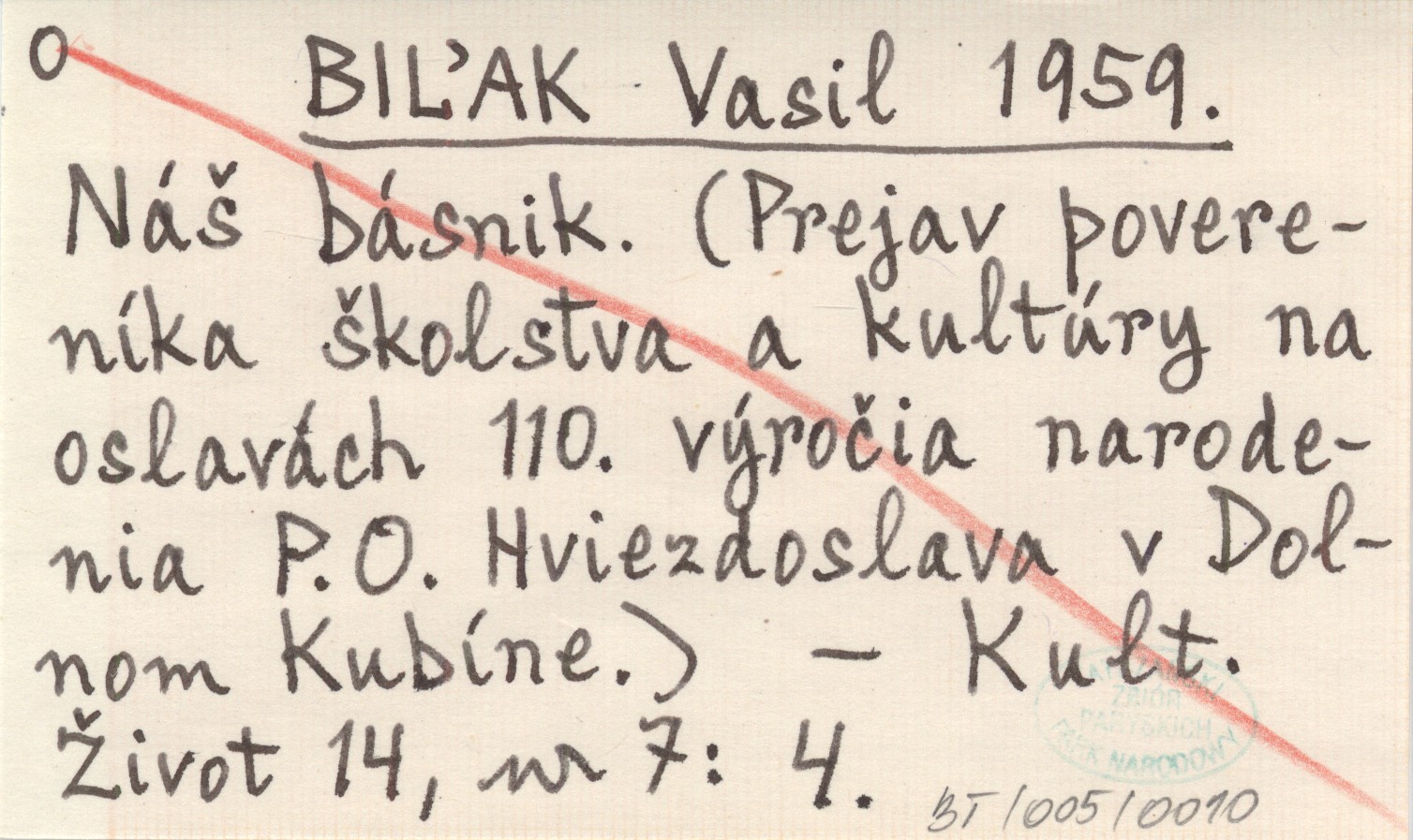 BI¥AK Vasil 1959 Ná¹ básnik. (Prejav povereníka ¹kolstva a kultúry na oslavách 110. výroèia narodenia P.O. Hviezdoslava v Dolnom Kubíne.)