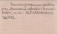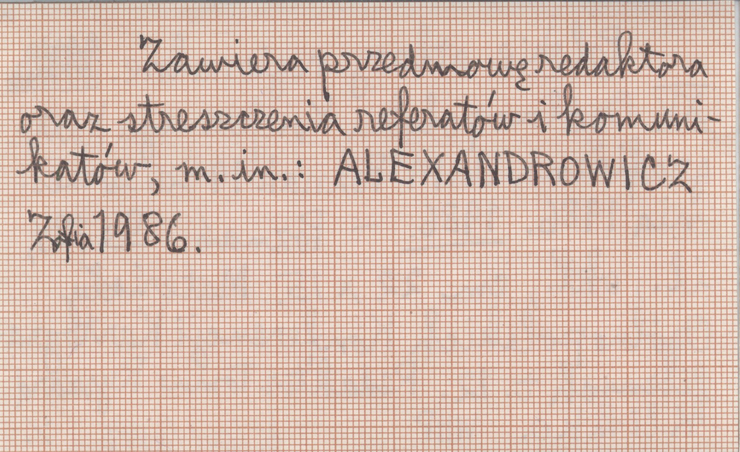 Poznań (Materiały Ogólnopolskich Konferencji Kartograficznych, t. 12) , 184 s., il., okł., 22x15 cm. Zawiera przedmowę redaktora oraz streszczenia referatów i komunikatów, m. in. ALEXANDROWICZ Zofia 1986.