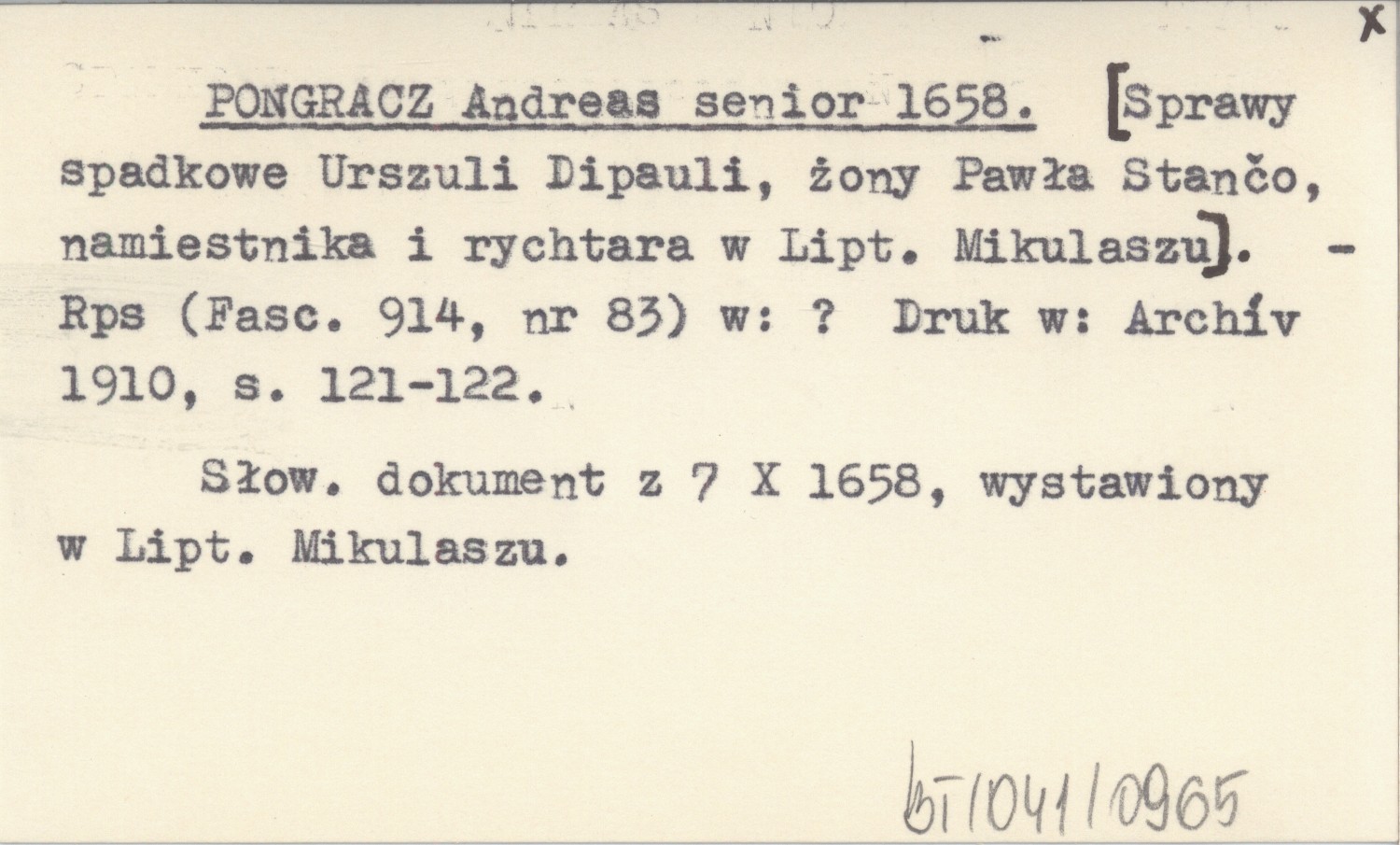 PONGRACZ Andreas sen. 1658 [Sprawy spadkowe Urszuli Dipauli, żony Pawła Stančo, namiestnika i rychtara w Lipt. Mikulaszu.]