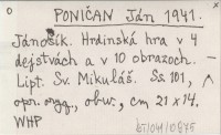 PONIČAN Ján 1941 Jánoąík. Hrdinská hra v 4 dejstvách a v 10 obrazoch.