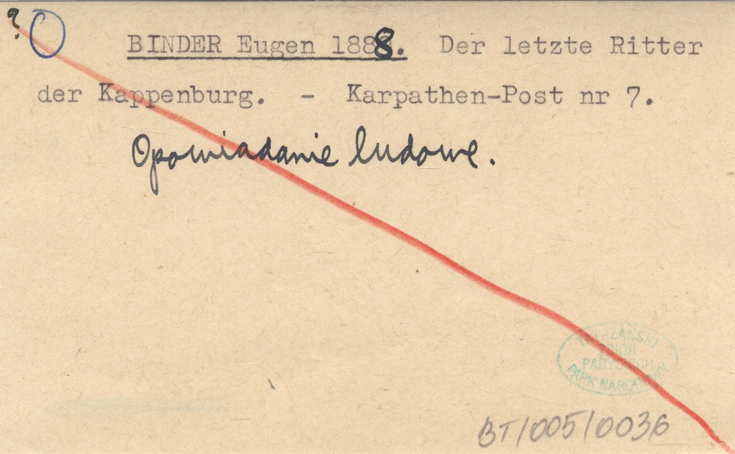 BINDER Eugen 1888 Der letzte Ritter der Kappenburg.