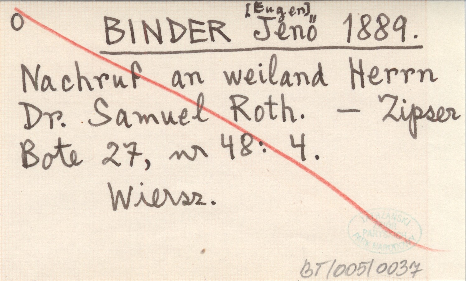 BINDER Jenő [Eugen] 1889 Nachruf an weiland Herrn Dr. Samuel Roth.