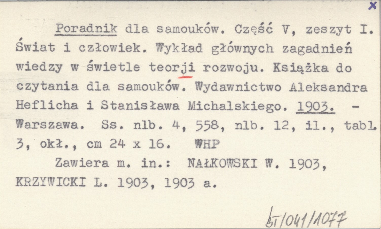 Poradnik dla samouków. Część V, zeszyt I. Świat i człowiek. Wykład głównych zagadnień wiedzy w świetle teorji rozwoju. Książka do czytania dla samouków. 1903
