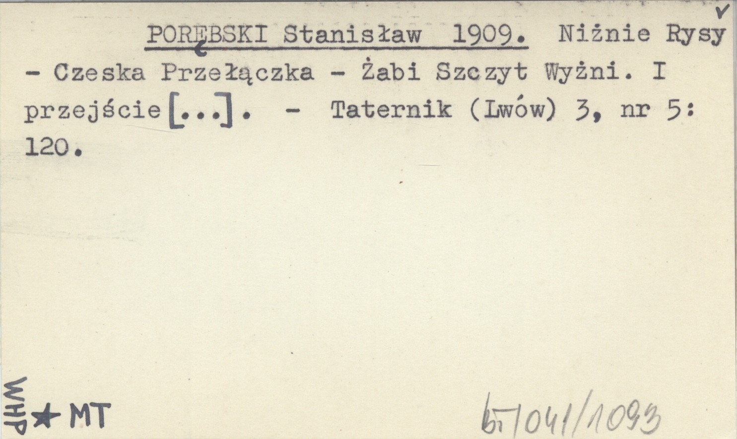 PORĘBSKI Stanisław 1909 Niżnie Rysy - Czeska Przełączka - Żabi Szczyt Wyżni. I przejście [...].