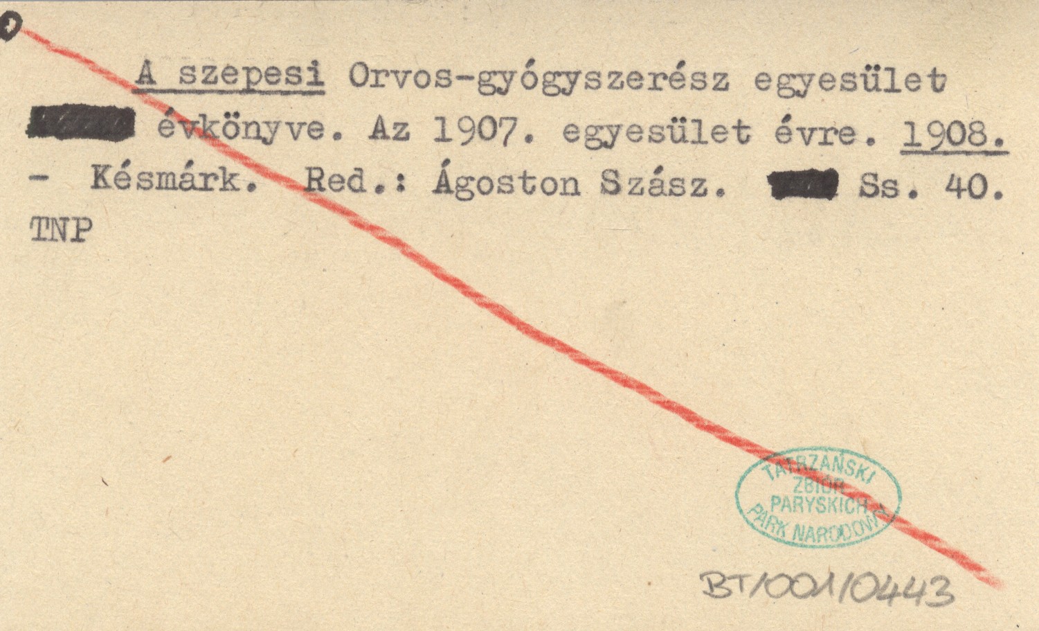 RED: Szász, Ágoston. ; A szepesi Orvos-gyógyszerész egyesület évkönyve. Az 1907. egyesület évre. 1908