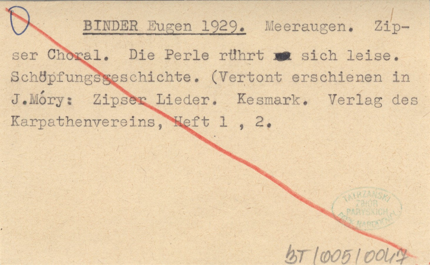 BINDER Eugen 1929 Meeraugen. Zipser Choral. Die Perle rührt sich leise. Schöpfungsgeschichte. (Vertont erschienen in J.Móry: Zipser Lieder.