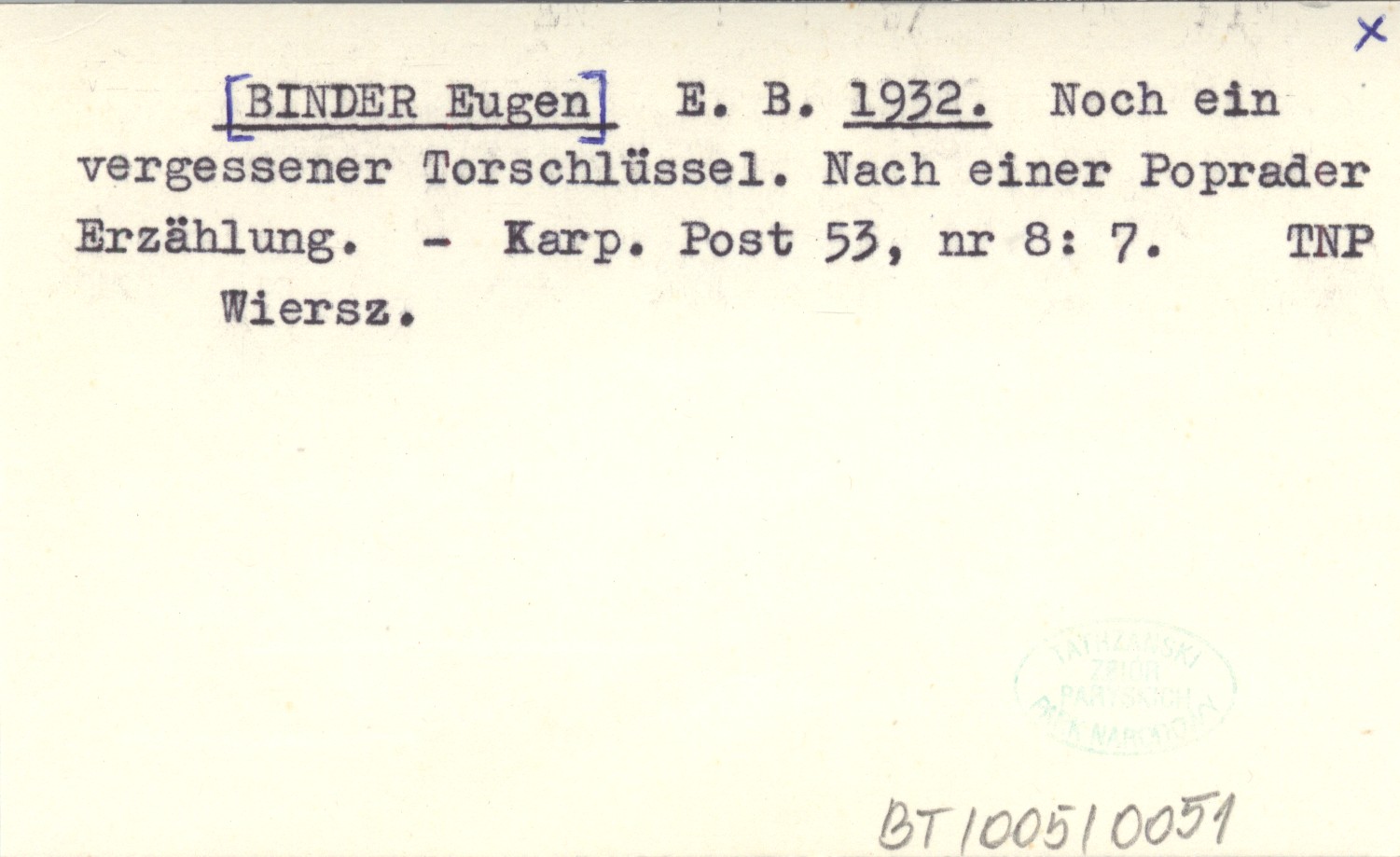 E. B. [BINDER Eugen] 1932 Noch ein vergessener Torschlüssel. Nach einer Poprader Erzählung.