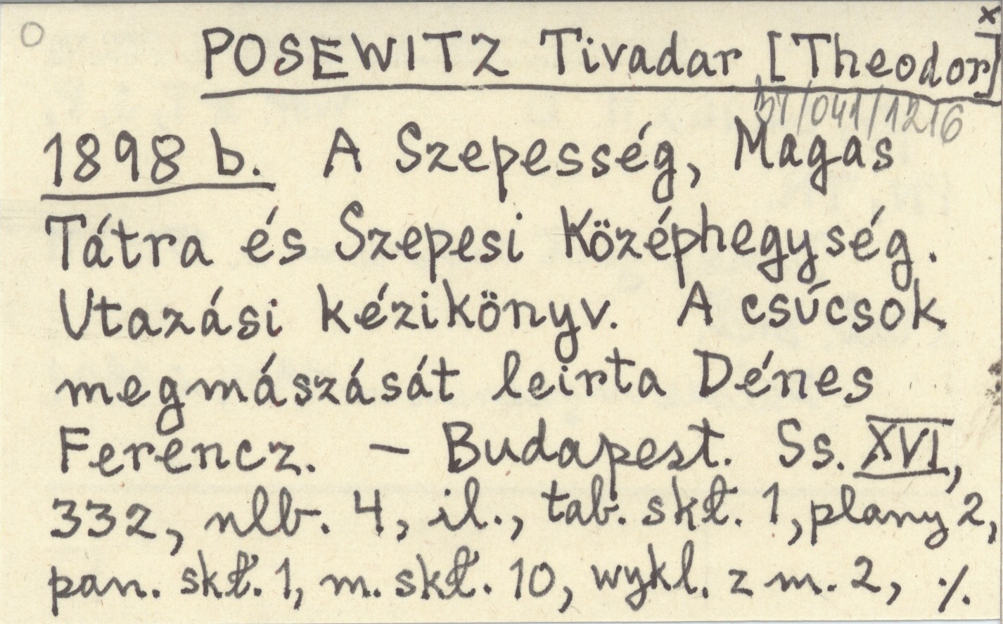 POSEWITZ Tivadar [Theodor] 1898 b A Szepesség, Magas Tátra és Szepesi Középhegység. Utazási kézikönyv. A csúcsok megmászását leira Dénes Ferencz.