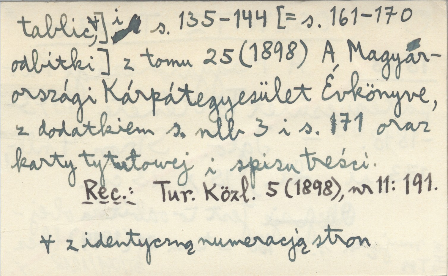 Igló , [4], 173 s., il., okł., 15x23 cm. Jest to odbitka obejmuj±ca s. 1-160 z tomu 21 (1894) [bez tablic z identyczn± numeracj± stron] i s. 135-144 [= 161-170 odbitki] z tomu 25 (1898) A Magyarországi Kárpát Egyesület Évkönyve z dodatkiem s. [3] i s. 171 oraz karty tytułowej i spisu tre¶ci. REC: Turista Közlöny 5 (1898), nr 11: 191.