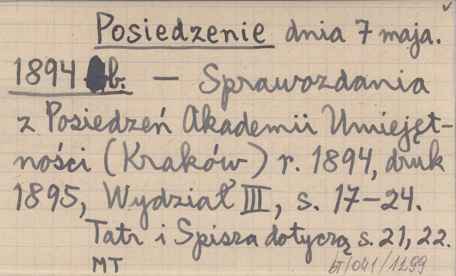 Sprawozdania z Posiedzeń Akademii Umiejętności (Kraków) , R. 1894, druk 1895, Wydział III: 17-24. Tatr i Spisza dotyczą s. 21, 22.
